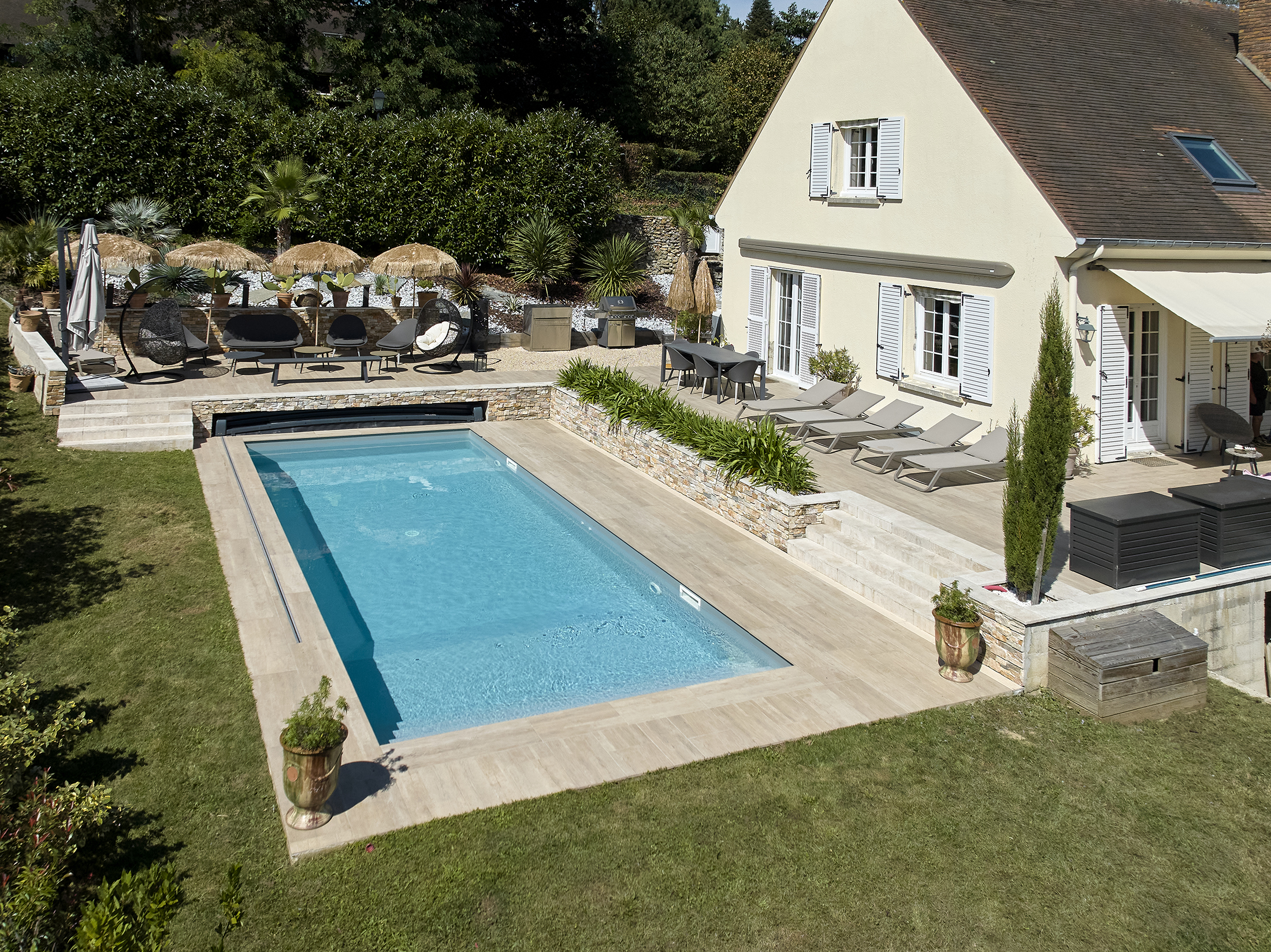 À Chambourcy, commune résidentielle prisée des Yvelines, l’esthétique de votre piscine est aussi importante que sa fonctionnalité. Notre approche paysagère prend en compte l’architecture locale et l’environnement naturel pour créer un espace harmonieux. Nous proposons des margelles en pierre naturelle qui s’accordent parfaitement avec les matériaux traditionnels de la région, et des plages de piscine en bois ou en pierre reconstituée qui s’intègrent élégamment dans votre jardin.