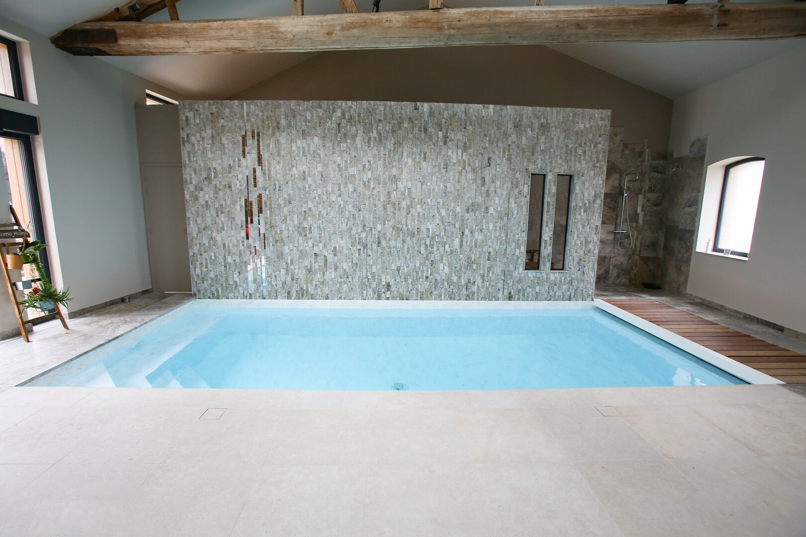 Aménagement d’une grange en pièce de détente avec piscine enterrée. Décorée par une architecte d’intérieure Mme GOUDARZI Adhraf. Mur en pierre naturelle avec miroir.