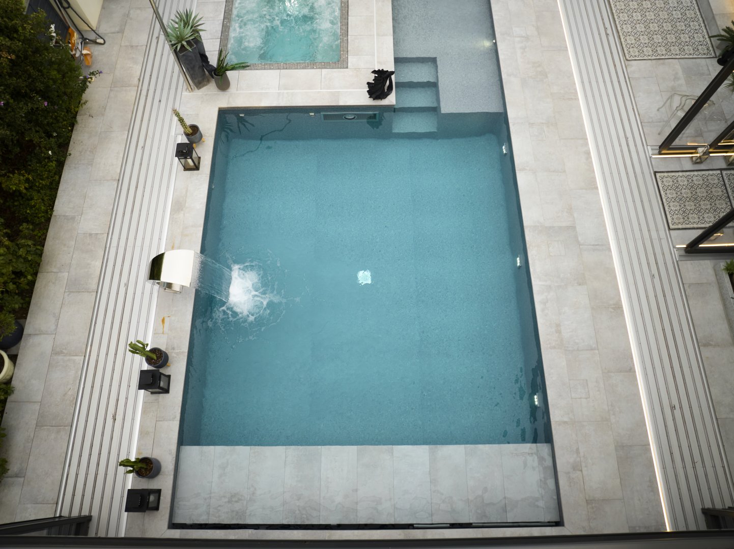 La rénovation de la piscine fut complexe de part un accès restreint. Le spa et l’abri de piscine ont dû être grutés par-dessus la maison.