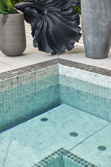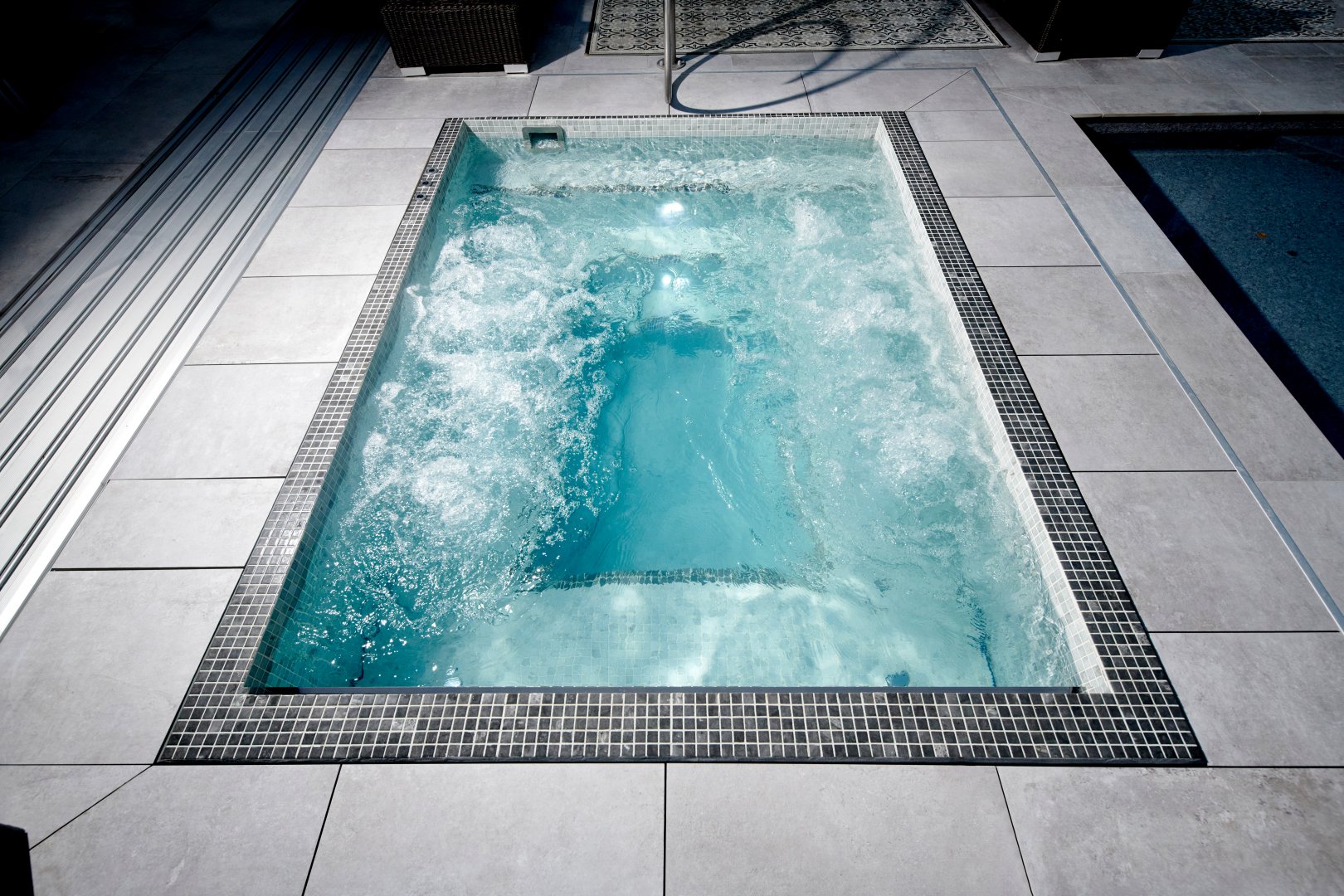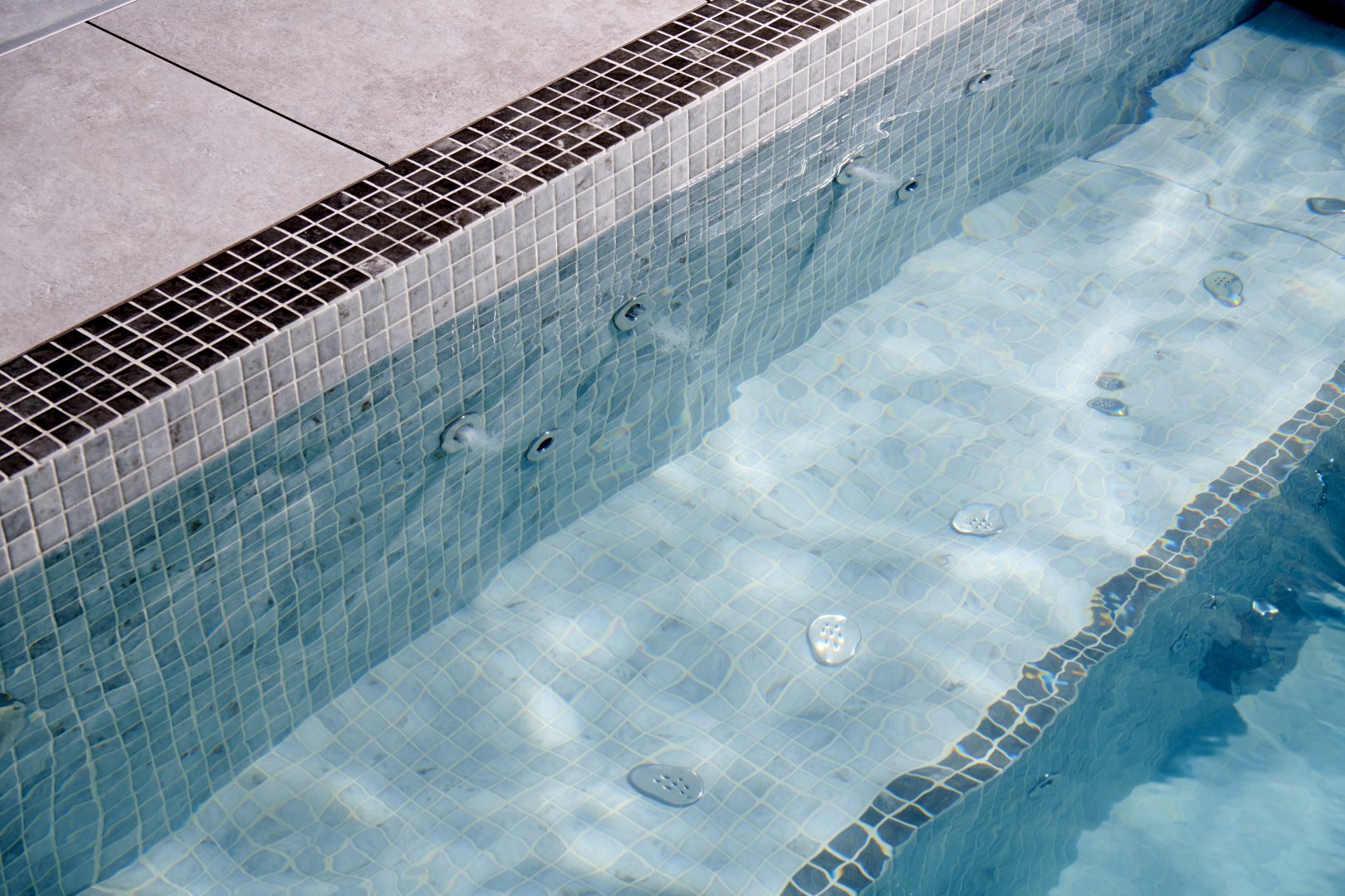 La partie de la piscine qui à été supprimée à été remplacée par un spa encastré en mosaïque de 2.80 x 2.20 m équipée d’un volet immergé.